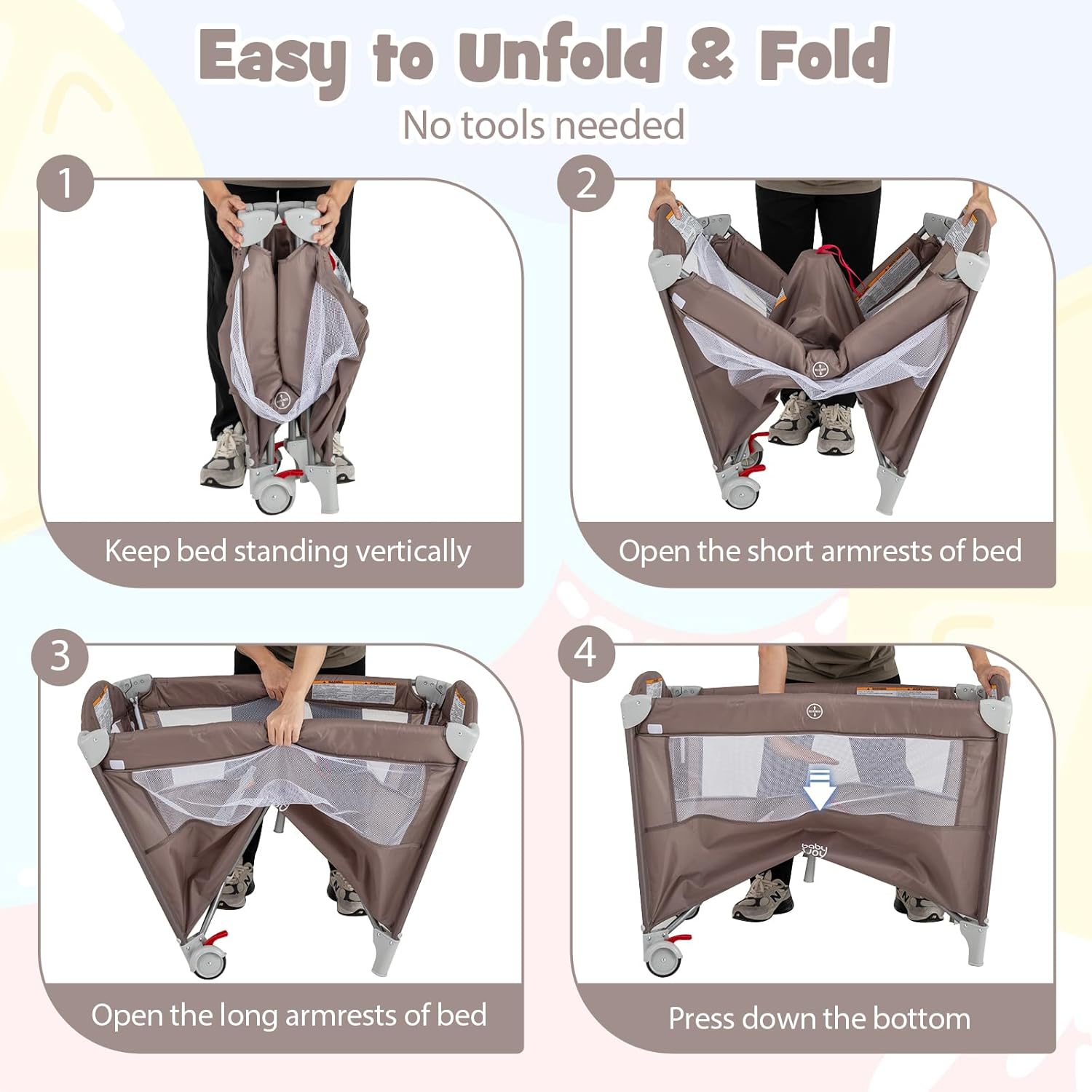 Su diseño plegable y fácil de montar permite desmontar el cambiador, el moisés y los estantes sin herramientas. Incluye una bolsa de transporte, ideal para viajes o visitas a familiares. Las ruedas universales con freno ofrecen movilidad y seguridad en cualquier momento.