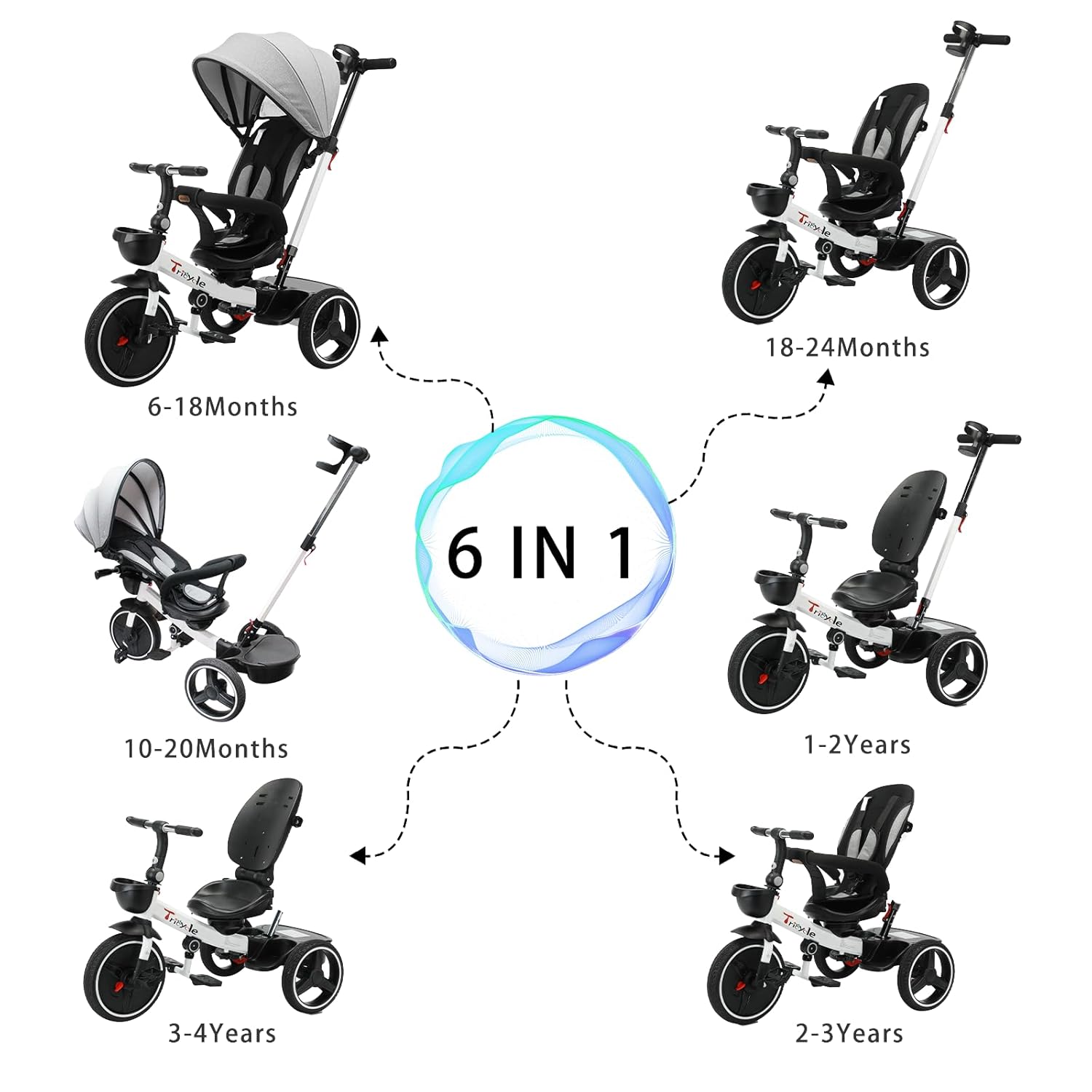 Made with premium materials, it features a carbon steel frame, breathable knitted fabric seat back, and puncture-proof all-terrain wheels suitable for any surface. This tricycle meets ASTM F963-17 and EN71 standards, ensuring durability and safety.